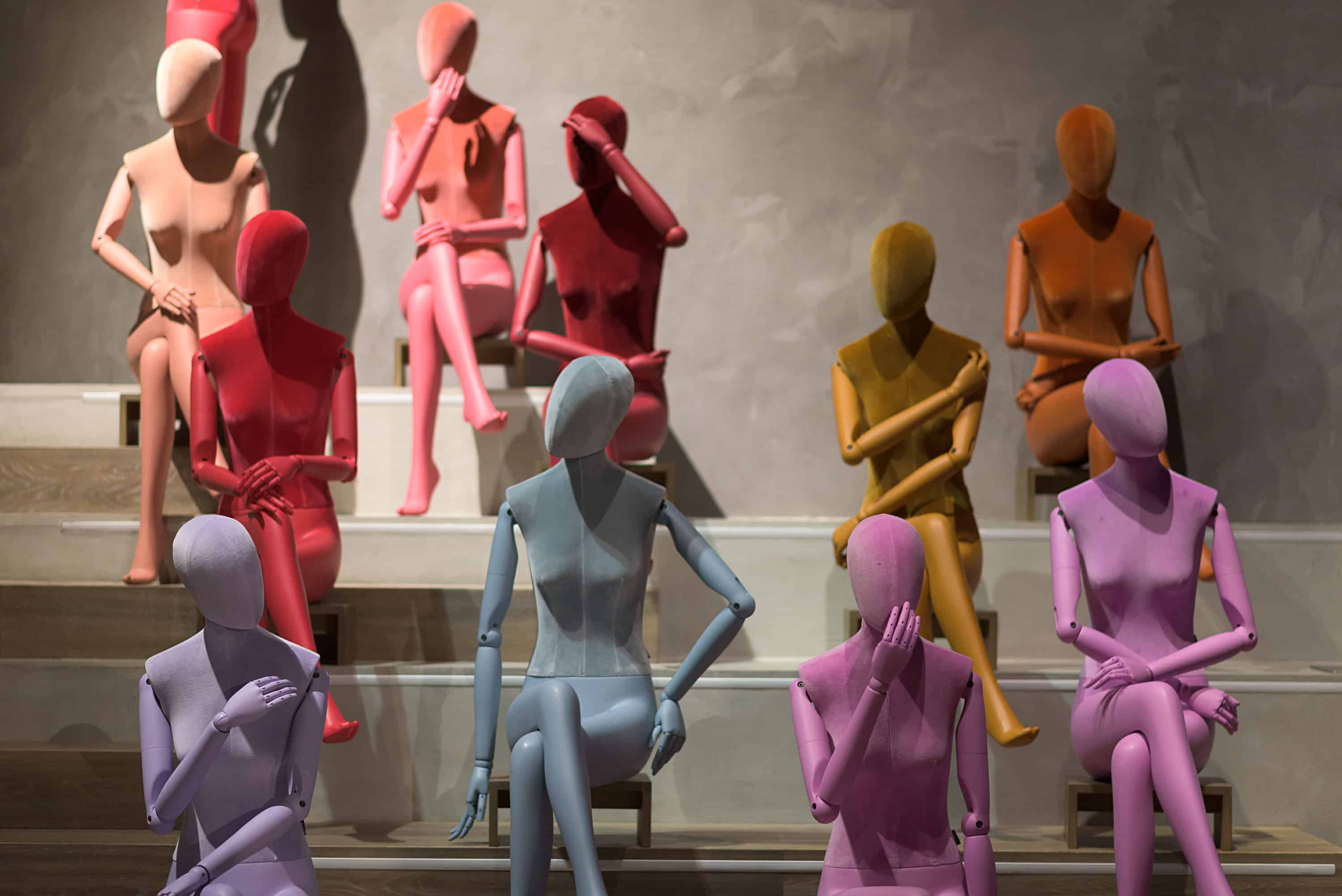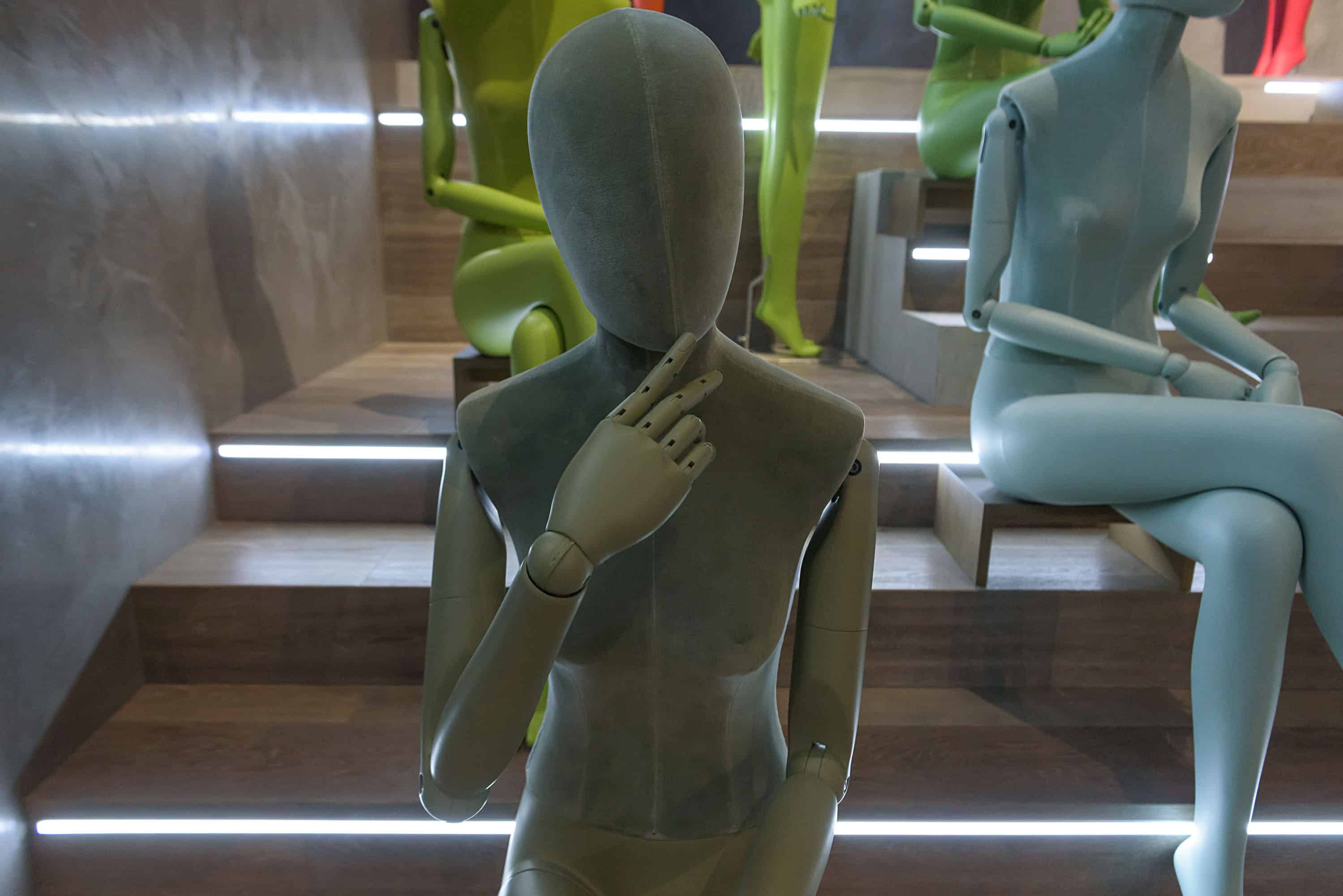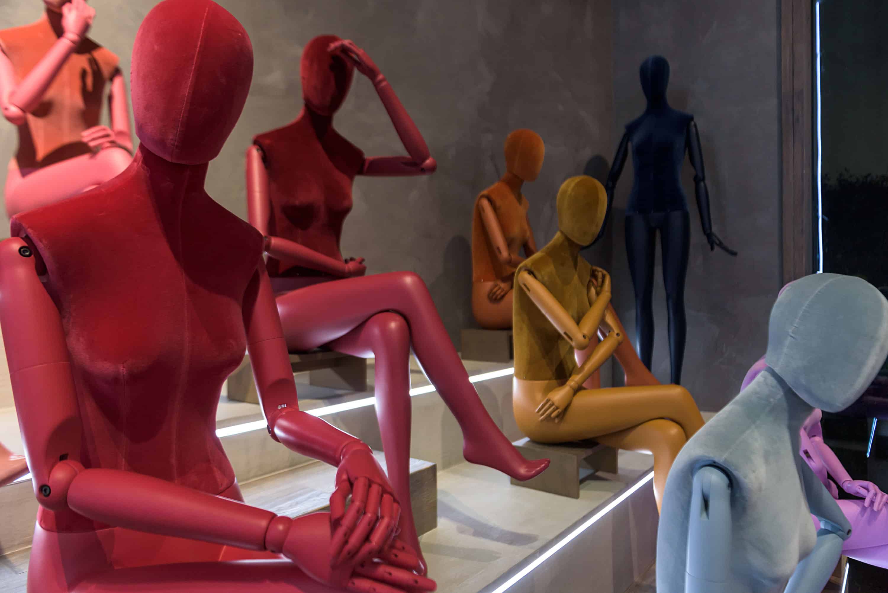 Chacun des mannequins est conçu avec des bras entièrement articulés, une position assise sur mesure et un système unique pour ajuster la position de la tête. Les bras et les jambes ont été minutieusement peints pour correspondre aux différents coloris de velours.
