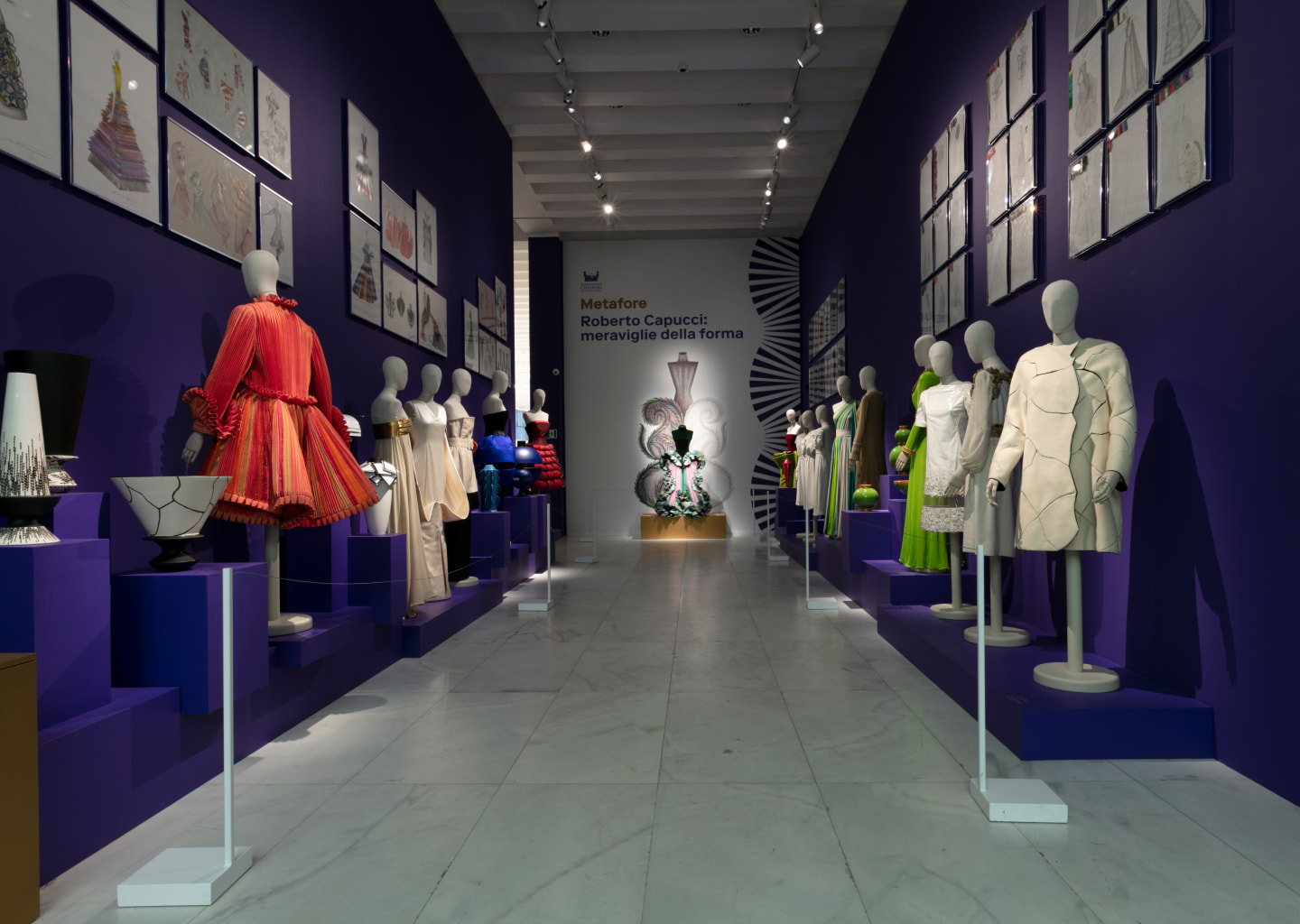 "Métaphores : merveilles de laforme" est l'exposition consacrée au parcours créatif de Roberto Capucci,figure emblématique du monde de la mode, créateur de vêtements qui ressemblentà des architectures et de sculptures de tissu. Ses créations sont agrémentéesde bustes sur mesure de l'atelier Bonaveri.